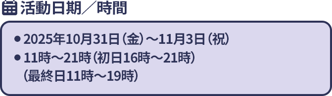● 25年10⽉31⽇(⾦)〜11⽉3⽇(祝) ● 11時〜21時(初日16時〜21時) (最終日11時〜19時)